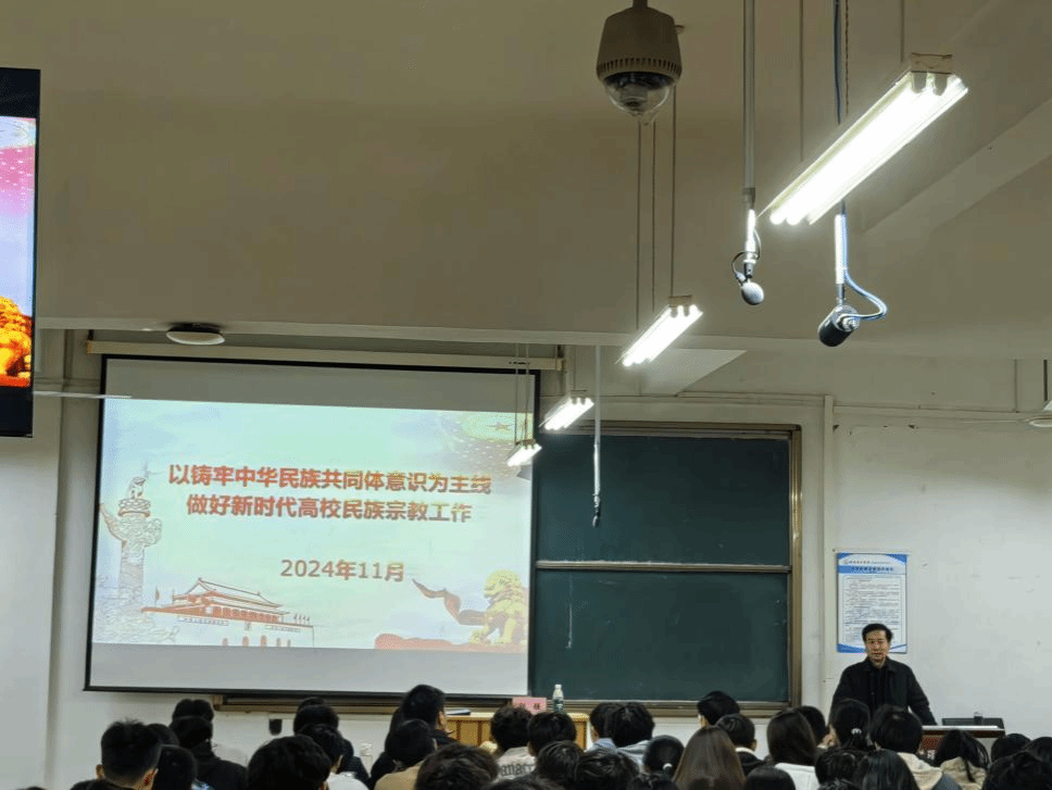 为进一步强化民族宗教政策法规的宣传教育,提升入党积极分子对民族团结与宗教工作重要性的理解,牢固中华民族共同体意识,2024年11月13日,我院于材料楼Ee301举办主题为“以铸牢中华民族共同体意识为主线,推动新时代党的民族宗教工作高质量发展”特色党课。本次培训由洛阳理工学院党委统战部部长郭强主讲,我院第33期全体入党积极分子全部参加。