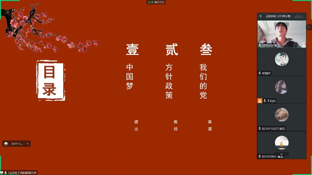 12月3日,为帮助大学生更深入地了解党史,材料科学与工程学院灯塔研习社在腾讯会议线上开展了以“国之强健路,吾辈当自强”为主题的宣讲分享会,灯塔研习社各讨论小组成员参加了此次活动。此次会议中,主讲人岳子清从中国梦、方针政策、我们的党这三个方面阐述了何为“惊天动地大复兴”。
