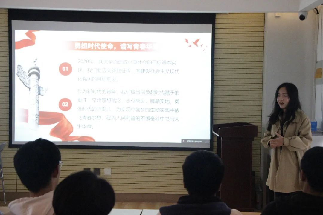 最后,她立足当下,展望未来,呼吁大家作为新时代的青年,应当肩负起时代赋予的重任,坚定理想信念,志存高远,脚踏实地,勇做时代的弄潮儿,在实现中国梦的生动实践中放飞青春梦想,在为人民利益的不懈奋斗中书写人生华章。通过这次活动,不仅增强了同学们的责任与担当意识,更让坚定了大家向着建设社会主义现代化强国的目标前进的决心!