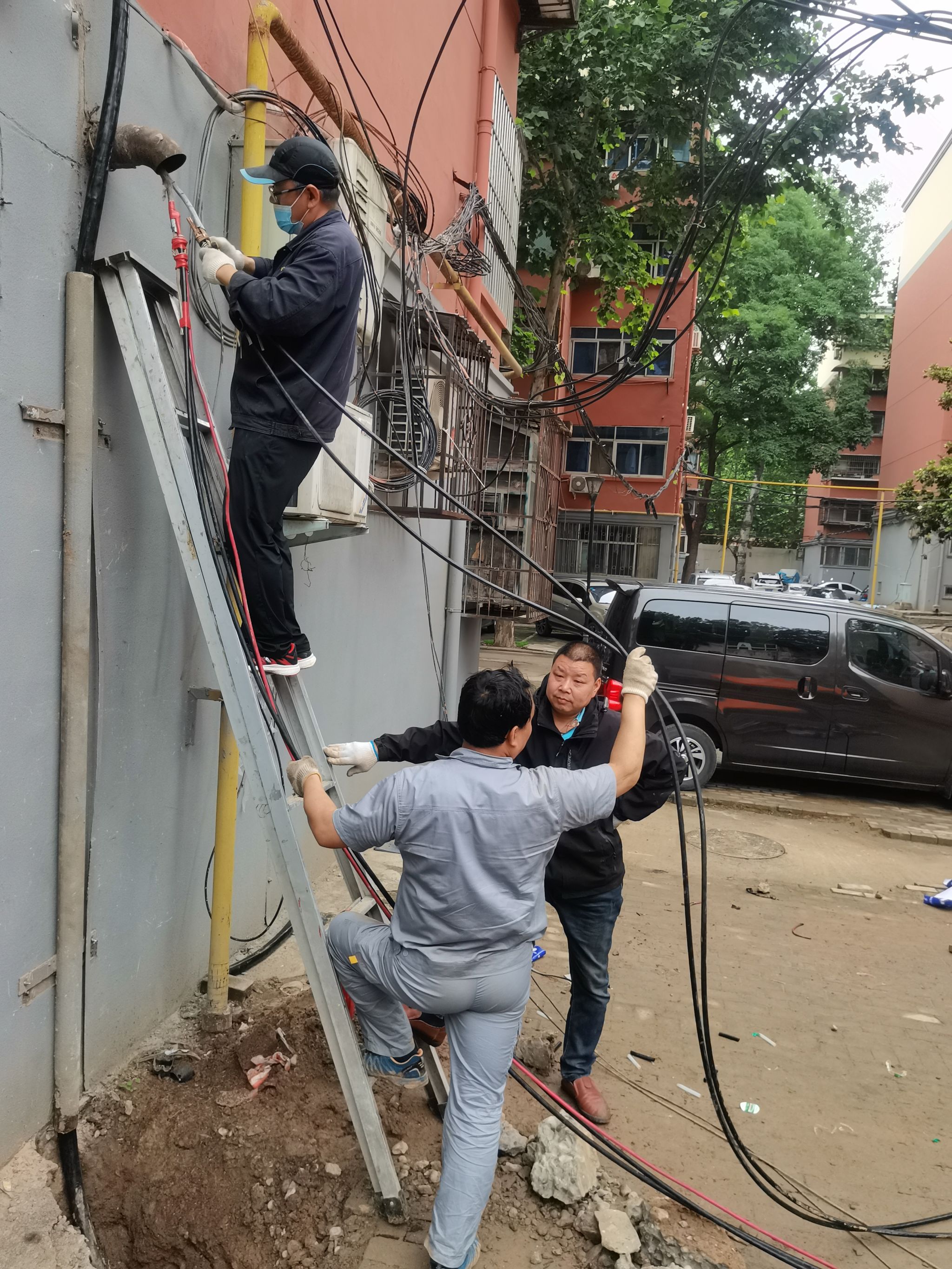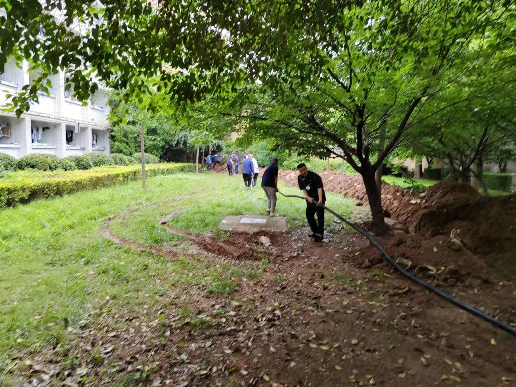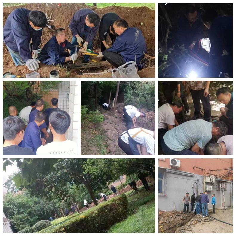 6月2日是星期五,此时天空正飘着雨,动力服务中心和工程修缮科的员工为了尽早恢复供电,冒雨排查故障点,因电缆深埋在离地面1米之下,排查难度大,经过员工连续奋战,珠江路家属区和铭三学生公寓电缆故障点分别在13:40和22:10先后查找到,并连夜订购电缆。6月3日,雨一直在下,但是抢修工作不能停,沟槽开挖、沉放电缆等关键环节有条不紊地进行着,但仅凭抢修人员无法独立完成,了解到这种情况后,物业服务中心公寓部立即组织10余名学生,饮食服务中心也安排10余名食堂员工前来助力,后勤管理处领导也亲临现场协调指挥,至当日晚8点,顺利完成沟槽回填工作。这时,员工们个个成了泥人,脸上分不清哪是雨水哪是汗水!6月4日,员工们抢抓下午天气短暂的放晴时机,争分夺秒进行电缆接头,17:50铭三公寓恢复供电,珠江路家属区19号楼也提前一天送电。