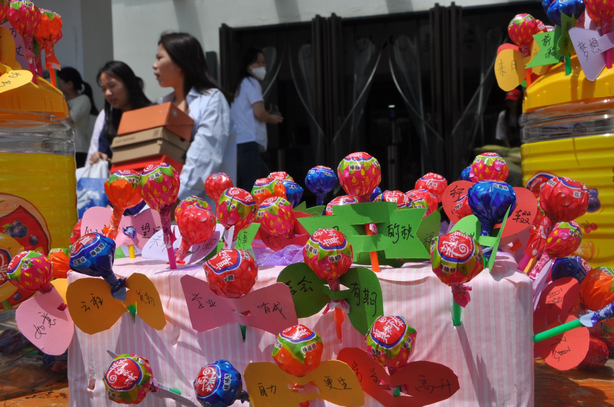 当天一大早,后勤的公寓宿妈们聚在一起,在一张张心形的卡纸上,书写着一份份离别的祝福,和准备好的棒棒糖合在一起,让人顿时感受到浓浓的爱意。