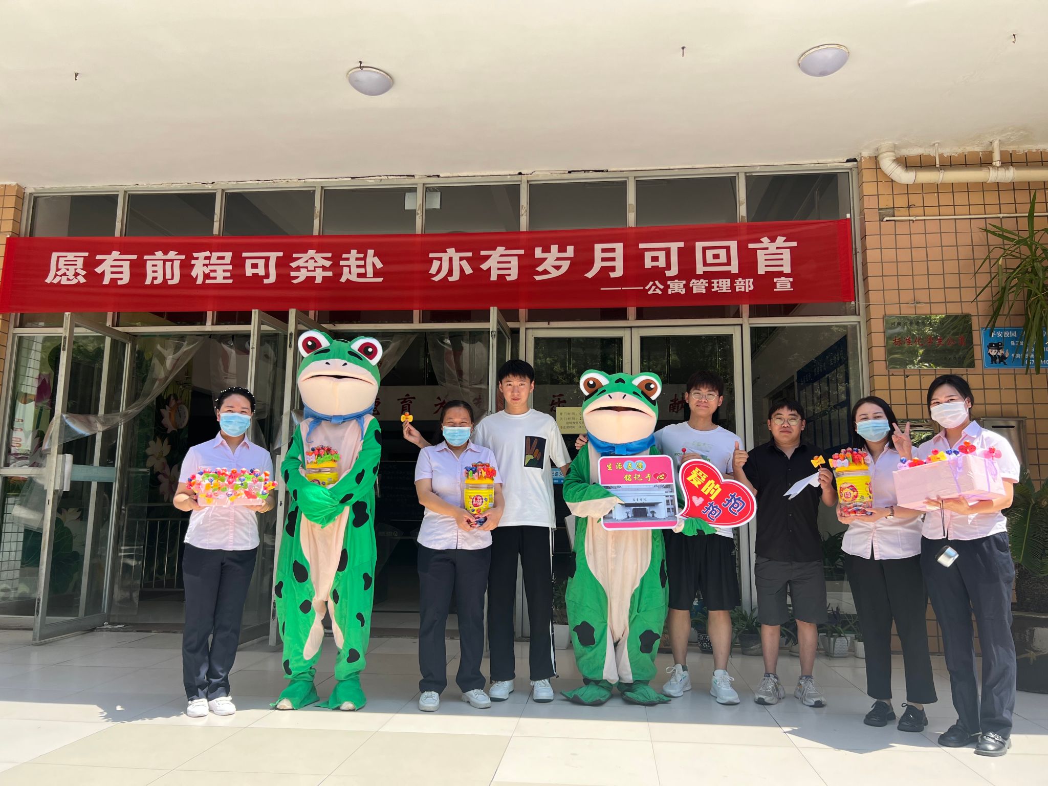 相见时难别亦难。6月5日上午10点半,王城校区致实书院门前的广场上,早早来了一群宿舍阿姨,他们穿着可爱的蛙蛙人偶,手捧彩色且写满祝福的糖果、高举“爱的拥抱”“生活点滴,铭记于心”标牌,唱着《一路顺风》离别歌等,等待着毕业典礼后手拿毕业证回家的孩子们。