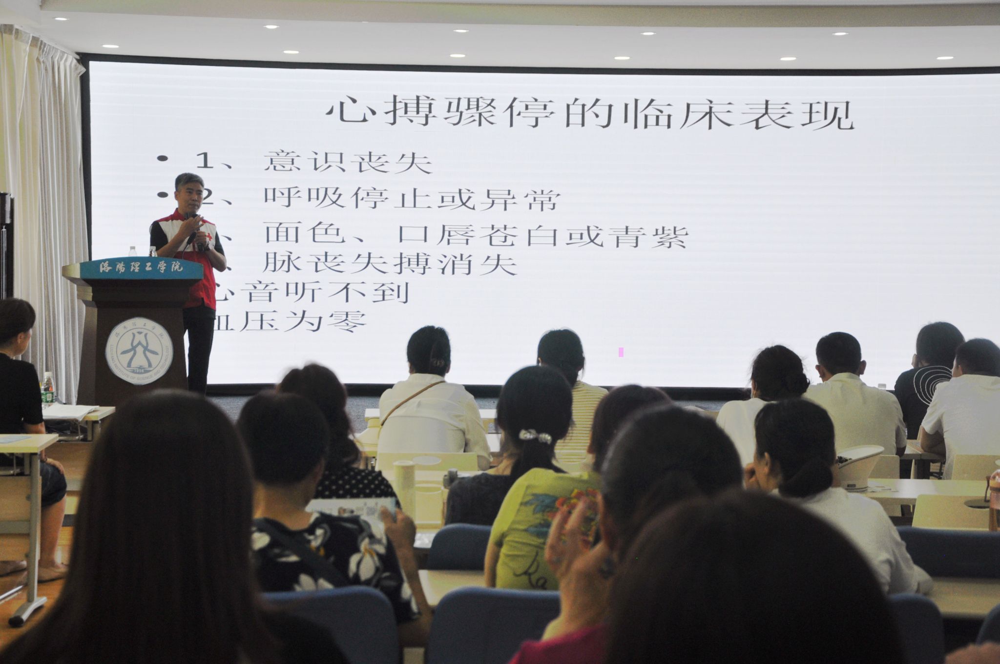 “人人讲安全,个个会应急”,在全校正在开展第22个安全生产月之际,6月26日下午,洛阳市红十字会专家在公共教学楼心理情景剧场为后勤员工开展了一次心肺复苏(CPR+AED)应急培训,我处各科室、中心共130名员工参加了此次培训。