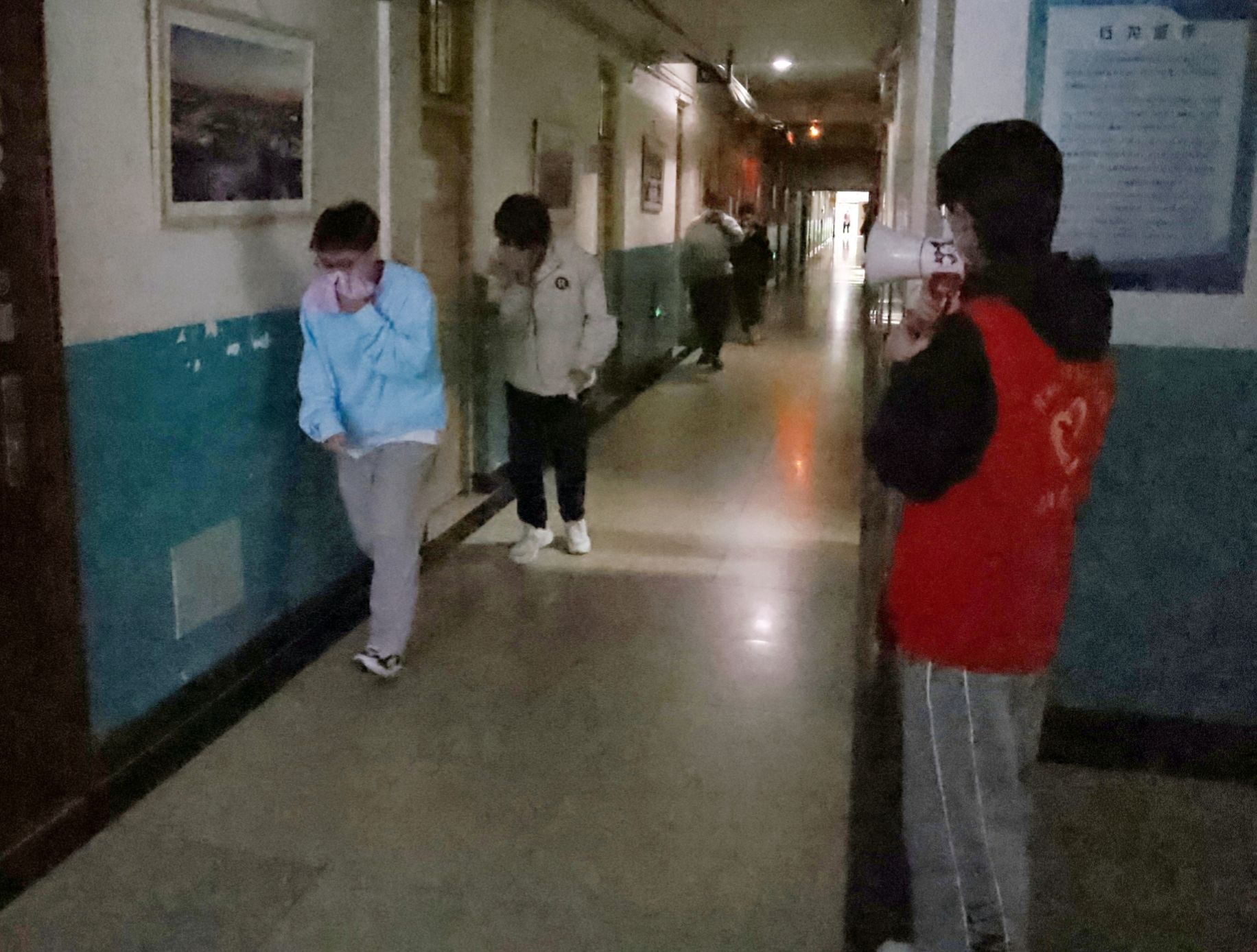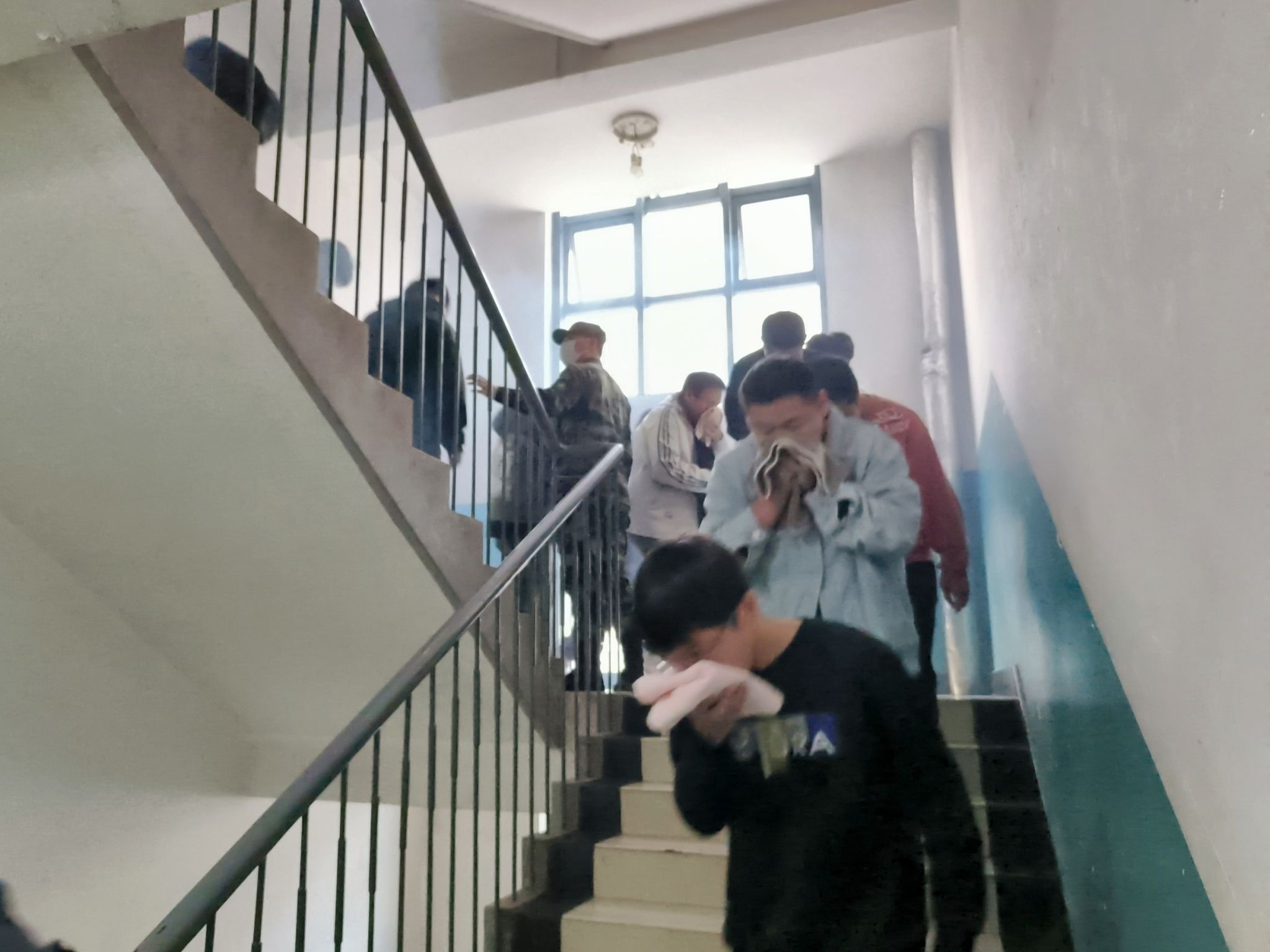 模拟火场设置好后,李老师下达演习命令,消防演练正式开始。同学们听从楼层安全员的指挥,用湿毛巾捂住口鼻,弯腰、低身、靠着墙,沿着最近的楼梯有序撤离,大家沉着冷静,安全员正确指挥,最终以最短的时间集合完毕,圆满完成本次疏散演练