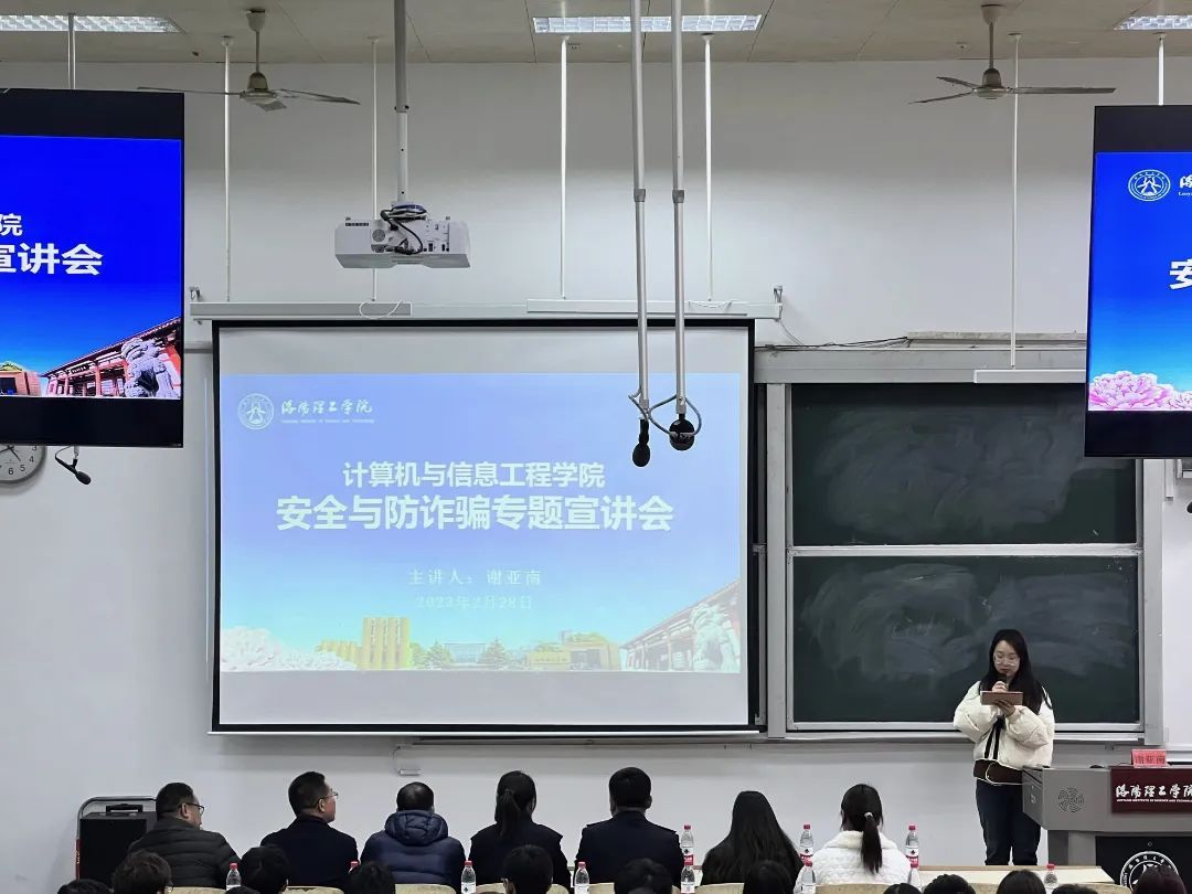 2月28日下午四点半,我院在XC1开展计算机与信息工程学院安全与防诈骗宣讲会。洛龙分局学府派出所副所长谢亚南、保卫处副处长周志平、学院党委副书记邵建伟、新生辅导员李远谋以及学府派出所和学府街道办事处工作人员出席会议,参会的还有2022级200位新生代表。学工办副主任张令玺主持会议。