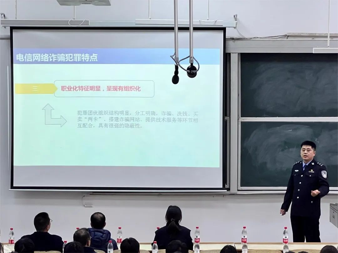 谢所长系统讲解了电信诈骗的定义、特点、案发形式,以生动的案例为基础带领同学们认识常见的电信诈骗类型,以案释法,结合近年来频繁发生的代办信用卡、贷款、兼职刷单、冒充领导、投资等一系列典型诈骗案例进行详细分析。引导大家通过“四不一要”和“灵魂八问”规避诈骗风险,增强防范意识,提升防诈本领。