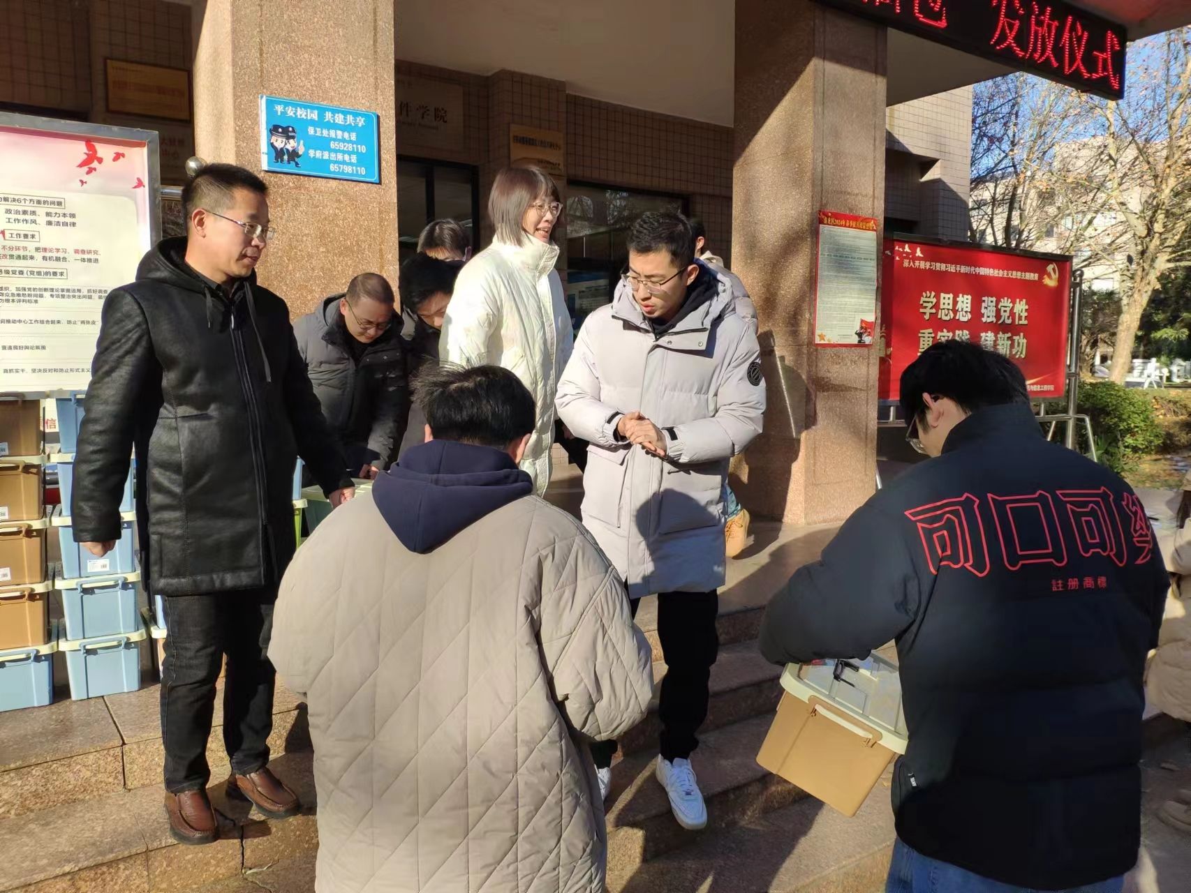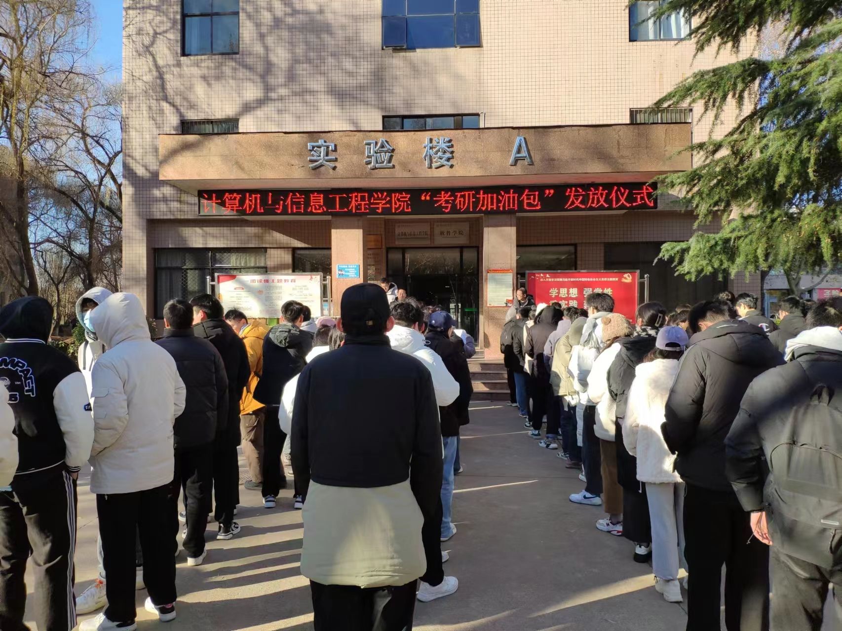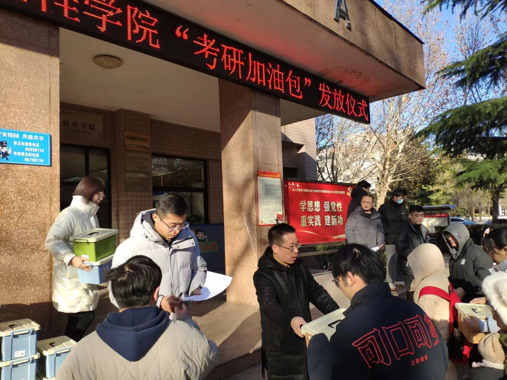 加油助力,暖心研考。为鼓励考研学生认真考试,缓解他们的考试压力,2023年12月21日,我院在实验A楼为2023年家庭经济困难考研学生发放“考研加油包”。学院党委副书记邵建伟和毕业班辅导员们亲手为同学们送上“考研加油包”和美好祝福,希望同学们放松心态、轻松应考,成功考取理想院校。