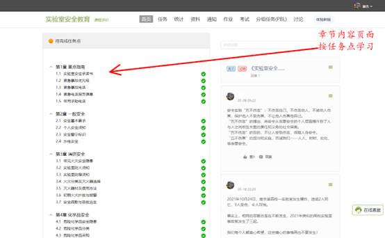 (2) 登录本人超星慕课学习网站,在“我学的课”中点击《实验室安全教育》进行章节内容学习页面,点击小节(任务点)开始学习。