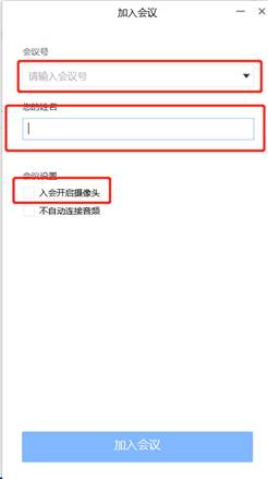 输入会议号、姓名,打开 “入会开启摄像头”,点击加入会议即可完成参会。