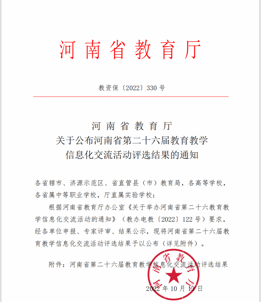 近日,河南省教育厅印发了《关于公布河南省第二十六届教育教学信息化交流活动评选结果的通知》(教资保【...