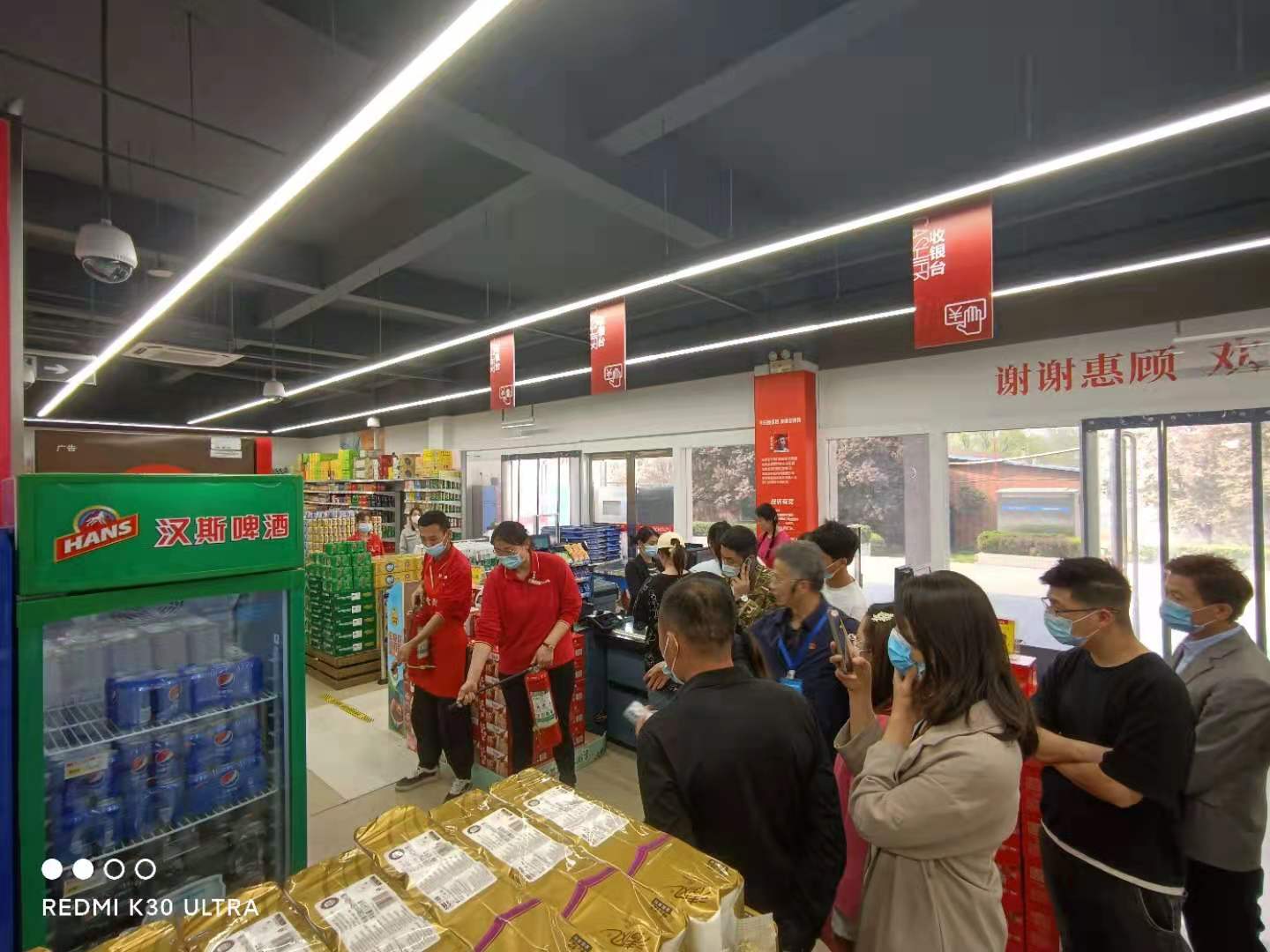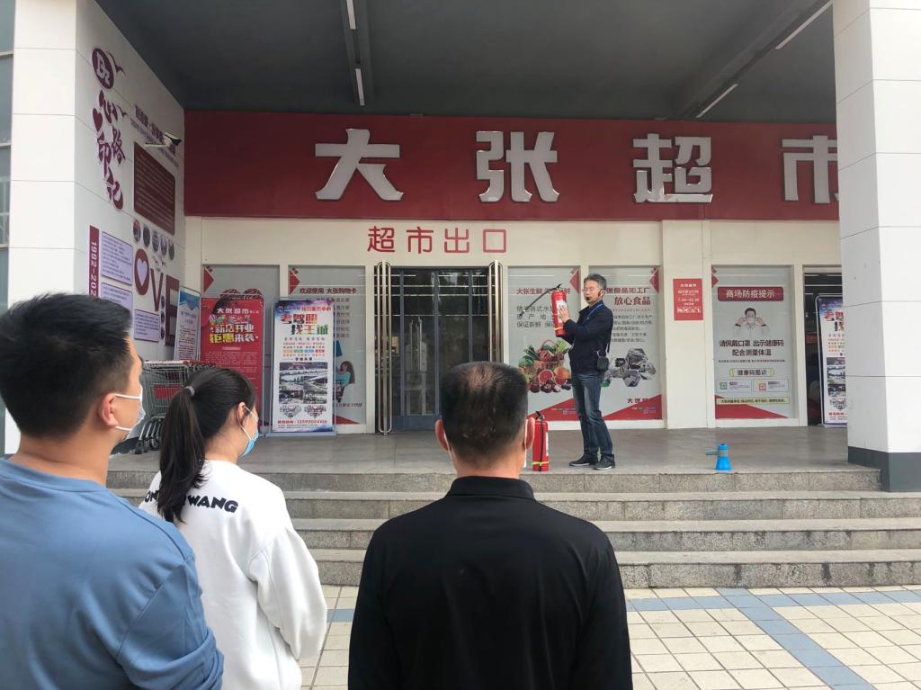 活动开始,首先,在大张超市里模拟发生火灾现场,紧急组织疏散店内所有人员,同时取出最近的灭火器,对准着火点进行灭火,直至消除着火点。